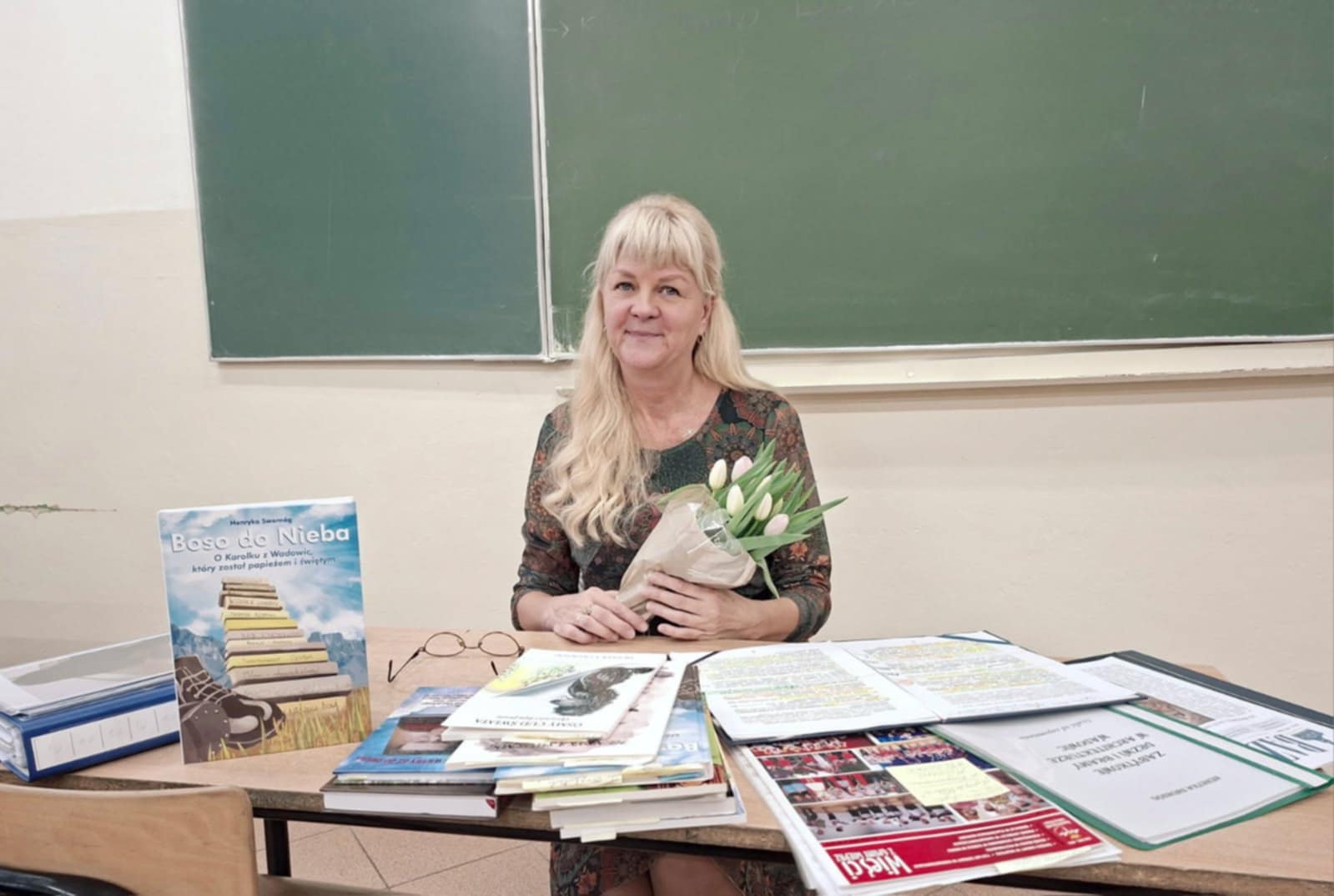 Dnia 15 X 2025 r. w naszej szkole odbyło się spotkanie z pisarką, panią Henryką Swornóg-Sobek. Pani Henryka jest wadowiczanką z urodzenia i z wyboru. Jest autorką książek dla dzieci i młodzieży. Zadebiutowała w 2015 r. opowiadaniem : „ Jak czarny kot sprawił, że Kasia przestała się bać piątku, trzynastego?”. W tym samym roku ukazało się jej opowiadanie: „ Mojej ukochanej matce-cichej bohaterce”. W 2016 r. wydała powieść : „Ósmy cud świata. Opowieści łapą pisane”. W tym samym roku opublikowała bajkę : „Jak dzieci razem z aniołem pokonały diabła i uratowały świat”. Pani Henryka jest laureatką wielu konkursów literackich- m. in. : Konkursu Jednego Wiersza w roku 2019 i w 2022 r. W 2020 r. w jubileusz setnej rocznicy urodzin św. Jana Pawła II wydała powieść biograficzną : „Boso do nieba. O Karolku, który dostał papieżem i świętym”. Stale wydaje artykuły w wadowickim czasopiśmie : „ Bazylika”. W styczniu 2023 r. pani Henryka uzyskała nominację do Kapituły Redakcji : „ Gazety Krakowskiej” i „Dziennika Polskiego” do tytułu „Osobowość Roku 2022 r” w kategorii „Kultura”. W lutym 2023 r. za wkład w życie kulturalne społeczności swojego regionu, została laureatką pierwszego miejsca w plebiscycie „Osobowość Roku 2022” w powiecie wadowickim.