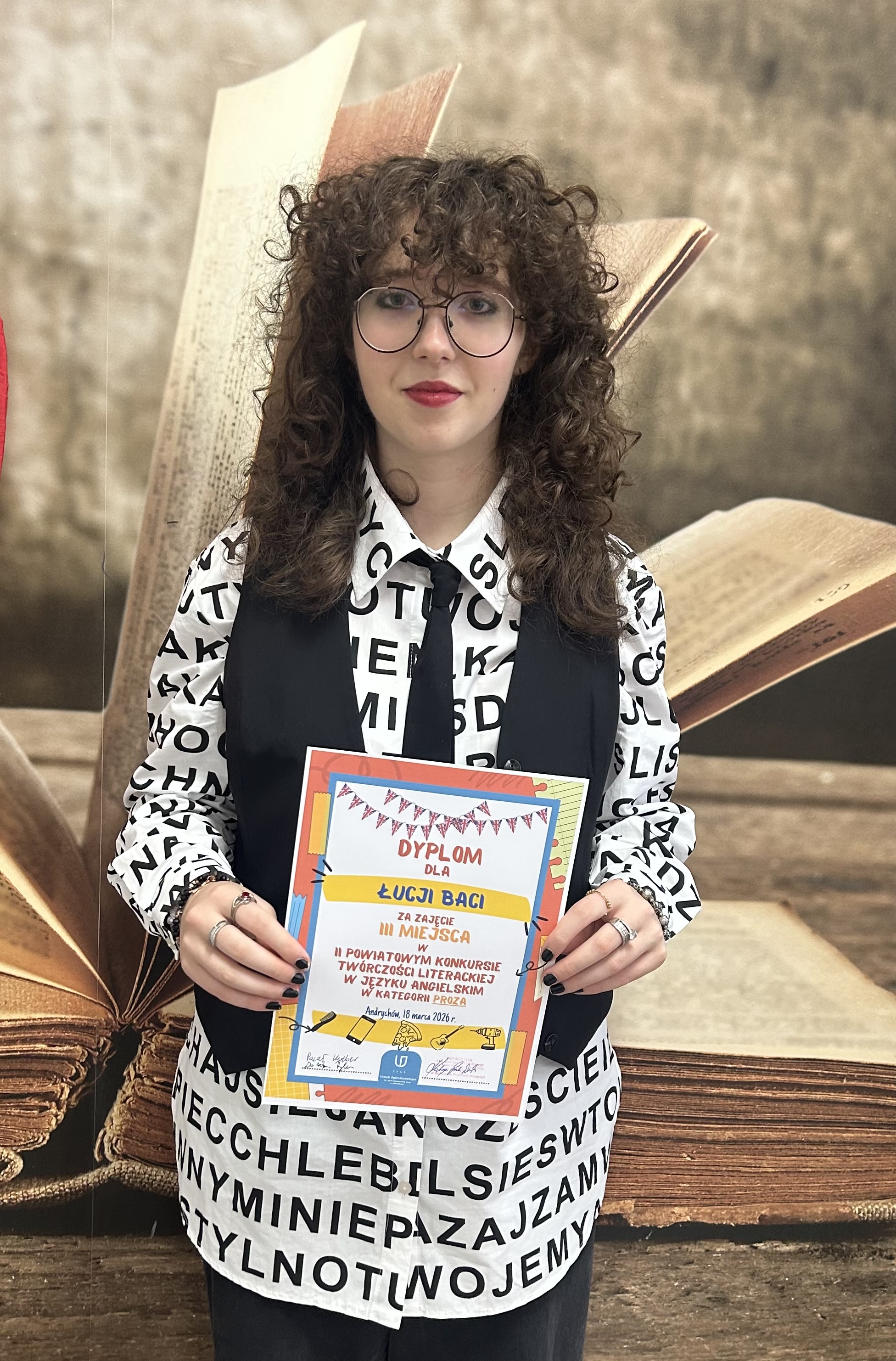 22.04.2026 r. odbyła się gala wręczenia nagród w Powiatowym Konkursie Twórczości Literackiej w Języku Angielskim, organizowanym przez I LO im. Marii Skłodowskiej Curie w Andrychowie. Nasza uczennica, Łucja Bacia z klasy 1C zajęła 3 miejsce w kategorii „proza”. Jej opowiadanie będzie opublikowane w „Curierze Licealnym”, a także na stronie internetowej andrychowskiego liceum. Gratulujemy!!!